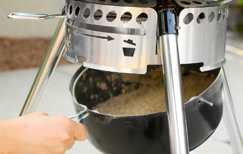 La rejilla de cocción de acero chapado con sistema abisagrado permite añadir carbón fácilmente durante la cocción sin tener que retirarla.