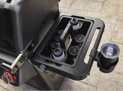 - Mesa lateral Weber Works, compatible con accesorios insertables opcionales, como cubetas con tapa, tablas de corte o kits de preparación y servicio, para cocinar con mayor comodidad.
