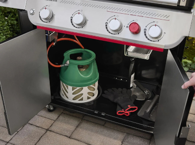 El armario con puerta permite ocultar la bombona de propano y los accesorios de barbacoa, manteniéndolos protegidos y perfectamente organizados.